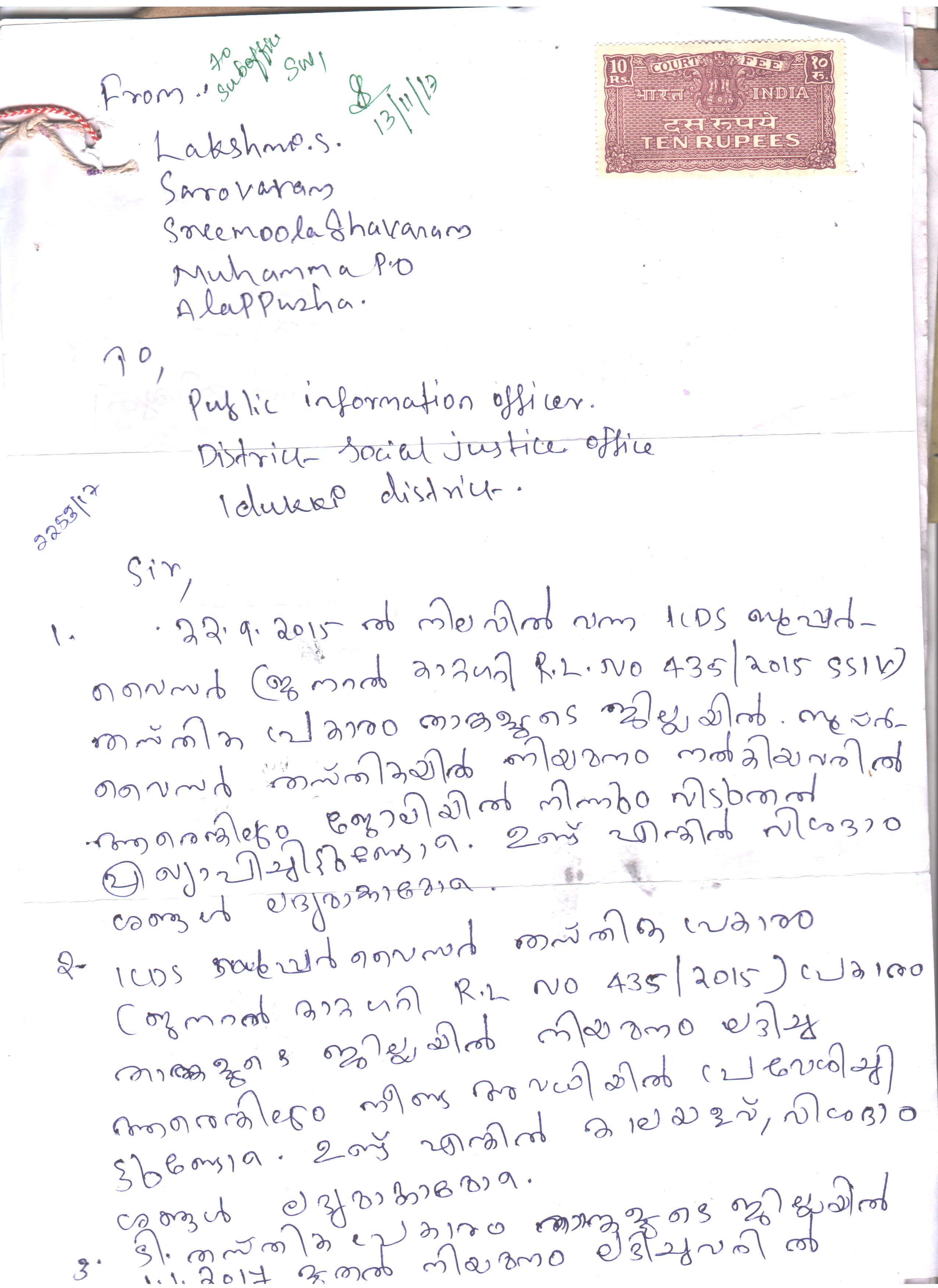 KSD വൃദ്ധസദനം - ജോലിയില് നിന്നും പിരിച്ച് വിടപ്പെട്ട കുക്ക് SMT. SAROJINI അതിനെതിരെ കോടതിയില് നിന്നും ലഭ്യമാക്കിയ സ്റ്റേ ഉത്തരവ് സംബന്ധിച്ച് |